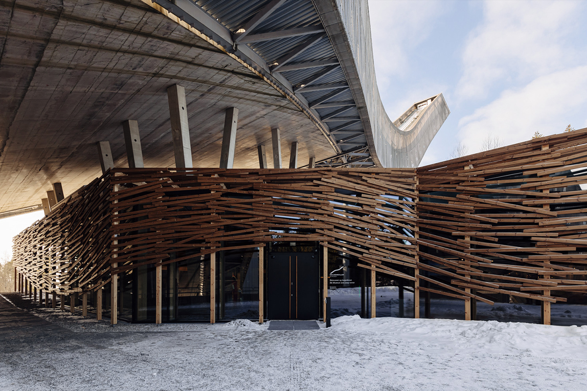 Με τις 1.207 ξύλινες δοκούς να θυμίζουν μπαστούνια του σκι, η είσοδος στην επέκταση του Μουσείου του Σκι στο Οσλο αλλάζει εντελώς την πρώτη εντύπωση για τον επισκέπτη. Πίσω από το project βρίσκεται η πασίγνωστη νορβηγική εταιρεία Snøhetta. Εμπνευση άντλησε από το γειτονικό δάσος, την πίστα του σκι, αλλά και τους Χειμερινούς Ολυμπιακούς Αγώνες του 1952, οι οποίοι διοργανώθηκαν στη νορβηγική πρωτεύουσα. Από τα πόστερ της περιόδου οι σχεδιαστές εμπνεύσθηκαν το τιρκουάζ φως που λούζει τον χώρο της καινούργιας καφετέριας και του μπαρ.