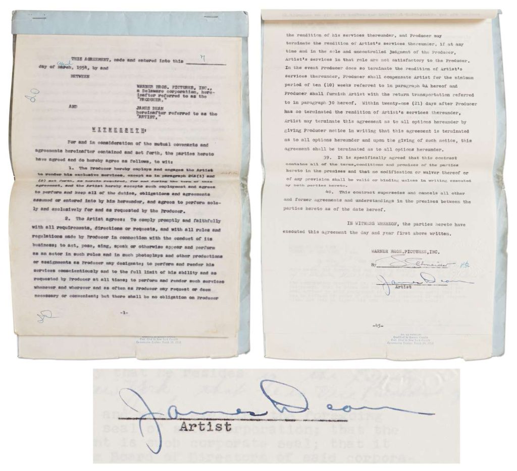 Πρόκειται, άλλωστε, για το μοναδικό συμβόλαιο που πρόλαβε να υπογράψει ο ηθοποιός, με τη Warner Bros, για την ταινία «Ανατολικά της Εδέμ». Σε αυτό ο Ντιν παραχωρούσε στο στούντιο την επιλογή να επεκτείνει το συμβόλαιό του για πολλές ακόμη ταινίες, ωστόσο θα ακολουθούσαν μόνο δύο. Ο οίκος δημοπρασιών το περιγράφει ως «ένα από τα πιο σημαντικά συμβόλαια υποκριτικής στην ιστορία του Χόλιγουντ» (η τιμή εκκίνησης είναι περίπου 2.800 ευρώ).