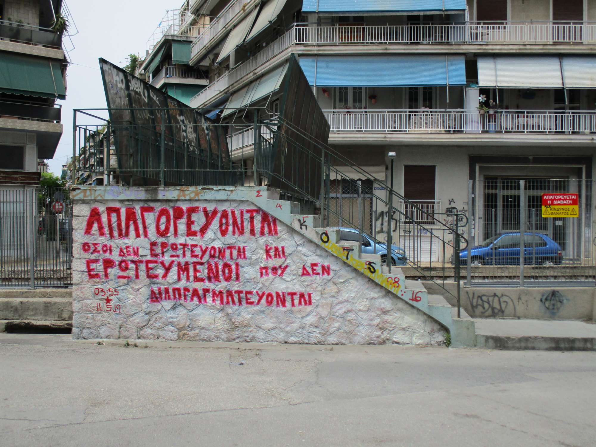 Για τη νέα του δημιουργία, επέλεξε έναν τοίχο επί της οδού Ιωνίας, μπροστά από τις γραμμές του ηλεκτρικού, μεταξύ σταθμού Αττικής και Αγίου Νικολάου. Γράφει λοιπόν με κατακόκκινα κεφαλαία γράμματα, που θυμίζουν καλό μαθητή που όμως επιλέγει να κάθεται στο τελευταίο θρανίο και να αφήνει το αποτύπωμά του την ώρα που βαριέται: «ΑΠΑΓΟΡΕΥΟΝΤΑΙ ΟΣΟΙ ΔΕΝ ΕΡΩΤΕΥΟΝΤΑΙ ΚΑΙ ΕΡΩΤΕΥΜΕΝΟΙ ΠΟΥ ΔΕΝ ΔΙΑΠΡΑΓΜΑΤΕΥΟΝΤΑΙ». Σε έναν αγγελικά πλασμένο κόσμο, αυτή η απαγόρευση όντως θα μπορούσε να ισχύσει. Ειδικά το δεύτερο σκέλος της, είναι και το πιο ουσιαστικό. Οταν οι ερωτικές, και γενικότερα οι ανθρώπινες σχέσεις τείνουν να θυμίζουν σκηνή ριάλιτι, με διαλόγους που δείχνουν άτομα να αναμασούν τα ίδια και τα ίδια χωρίς καμία πρωτοτυπία, τότε ναι. Η διαπραγμάτευση, είναι η λέξη – κλειδί. Το να κάνεις ένα βήμα πίσω, να δεις την κατάσταση από απόσταση και να εστιάσεις σε όσα σε ενώνουν και όχι σε όσα σε χωρίζουν. Αλλά μάλλον όλα αυτά είναι λόγια που πλέον δεν ακούς, απλά αν είσαι τυχερός, κάπου κάπου διαβάζεις με κόκκινα γράμματα στους τοίχους.
