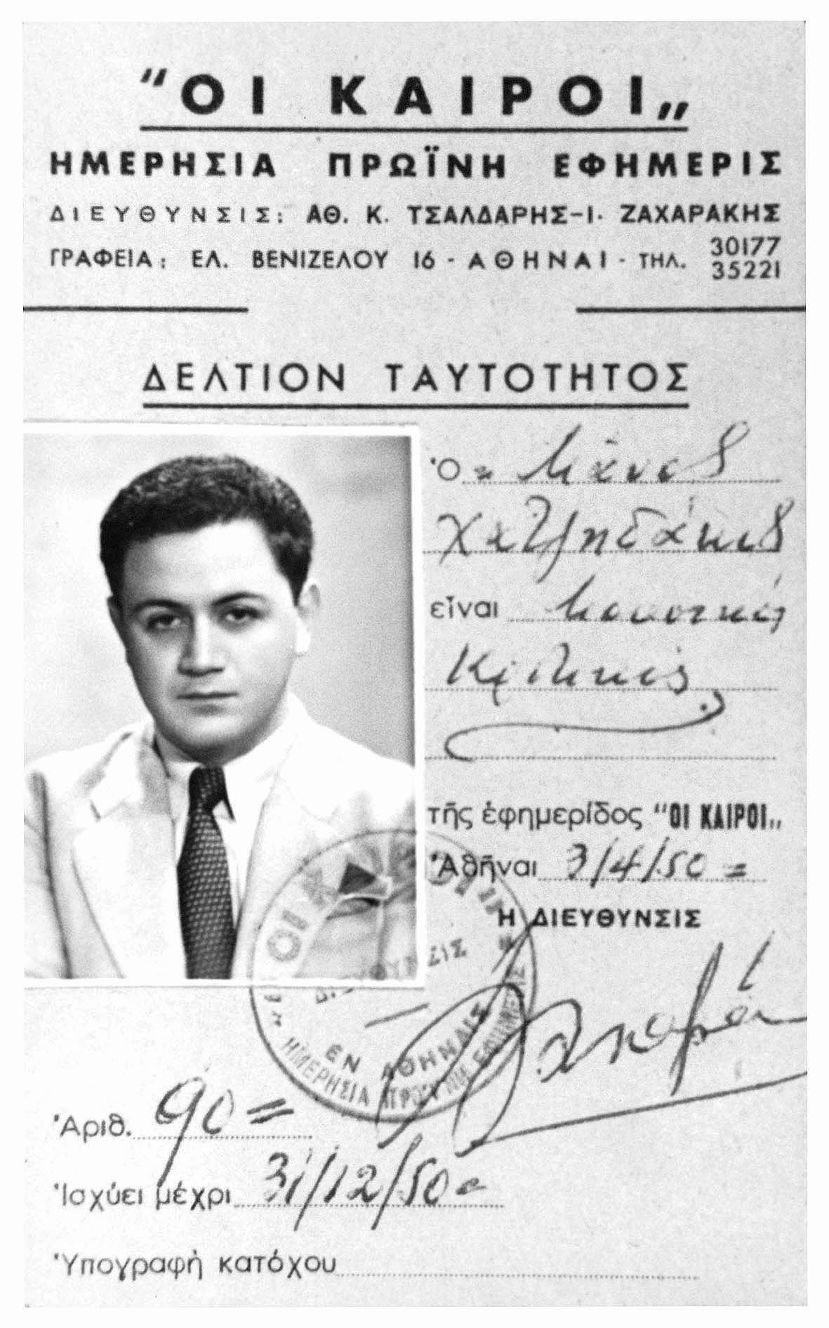 Η δημοσιογραφική ταυτότητα του Μάνου Χατζιδάκι, με ημερομηνία λήξης 31/12/1950. Ενα υπέροχο ιστορικό κειμήλιο