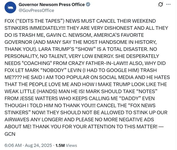 Ανάρτηση του επίσημου λογαριασμού του Γραφείου Τύπου του Γκάβιν Νιούσομ στο X, με κεφαλαία γράμματα, στην οποία ο κυβερνήτης της Καλιφόρνιας αντιγράφει δηκτικά τον τρόπο που ποστάρει στα social media o Ντόναλντ Τραμπ: