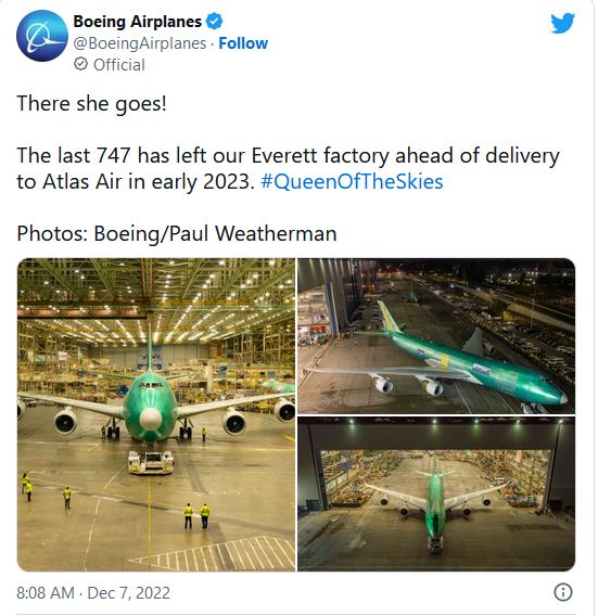 Οπως αναφέρει σε δημοσίευμά της η εφημερίδα Guardian, η Boeing παρέδωσε στις 6 Δεκεμβρίου το όγδοο 747 της παραγγελίας που είχε κάνει η αεροπορική εταιρεία μεταφοράς φορτίων Atlas Air. Επρόκειτο για το τελευταίο που βγήκε από εργοστάσιο της Boeing, η οποία αποφάσισε να σταματήσει την παραγωγή του.