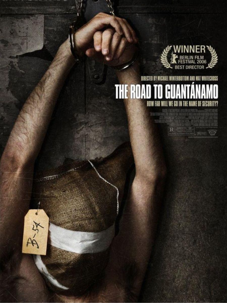 Η αφήγηση στον «Δρόμο για το Γκουαντάναμο» των Ματ Γουάιτκρος και Μάικλ Γουϊντερμπότομ (2006) ξεκινάει τον Σεπτέμβριο του 2001, λίγο μετά την τρομοκρατική επίθεση στους Δίδυμους Πύργους. Ο Ασίφ είναι ένας νεαρός βρετανός πακιστανικής καταγωγής, που ετοιμάζεται να ταξιδέψει στο Πακιστάν για να συναντήσει την υποψήφια σύζυγό του. Μαζί με τους φίλους του, Ρουέλ (που προαλείφεται για κουμπάρος), Σαφίκ και Μονίρ, επισκέπτονται ένα τζαμί με το που φτάνουν στο Πακιστάν. Εκεί ακούν την έκκληση ενός ιμάμη για ανθρωπιστική βοήθεια στο Αφγανιστάν. Οταν φτάνουν στη γειτονική χώρα, βιώνουν τους πρώτους βομβαρδισμούς των Αμερικανών εναντίον των Ταλιμπάν, ενώ ο Μονίρ εξαφανίζεται. Οι άλλοι τρεις συλλαμβάνονται από στρατιώτες, στοιβάζονται σε κοντέινερ και παραδίδονται στις αμερικάνικες δυνάμεις, στις 28 Δεκεμβρίου 2001. Σύμφωνα με το ντοκιμαντέρ, Αμερικανοί στρατιώτες τους ξυλοκοπούν και τους βασανίζουν, ενώ τελικά τους στέλνουν στις φυλακές της αμερικάνικης βάσης του Γκουαντάναμο, στην Κούβα. Η κουκούλα στην αφίσα ερέθισε τα μέλη της Αμερικανικής Ενωσης Κινηματογράφου, τα οποία την απαγόρευσαν καθώς «κουκούλα = βασανιστήρια».