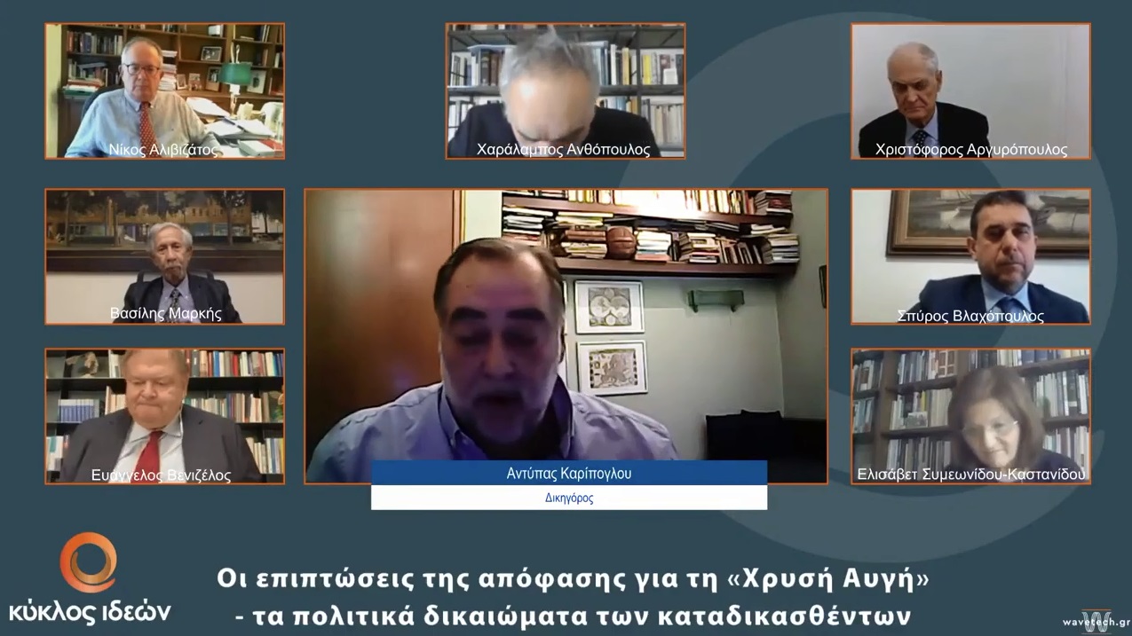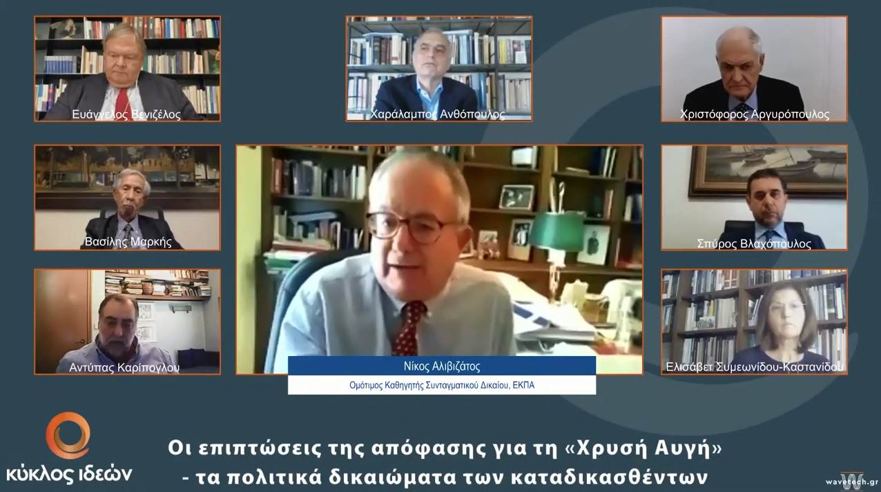 Την ποινική και συνταγματική «αλήθεια», στους κόλπους της οποίας διαμορφώνεται το πολιτικο-κοινωνικό σκηνικό μετά την καταδικαστική απόφαση στη δίκη της Χρυσής Αυγής, αναζήτησαν ο Βαγγέλης Βενιζέλος και επτά προσκεκλημένοι του, στη διαδικτυακή συζήτηση του Κύκλου Ιδεών, η οποία έλαβε χώρα νωρίς το απόγευμα της Δευτέρας, υπό τον τίτλο «Οι επιπτώσεις της απόφασης στη δίκη της Χρυσής Αυγής – τα πολιτικά δικαιώματα των καταδικασθέντων». Η συζήτηση καταδείχθηκε πολυδιάστατη και ζωηρή, σε κάθε περίπτωση ενδιαφέρουσα. Δεν έλειψαν ούτε οι οξύτατες κρίσεις για την εισαγγελέα του δικαστηρίου και την απαλλακτική της πρόταση («Έχω την αίσθηση, ότι άποψή της είναι ότι το Σύνταγμα είναι ουδέτερο στον ναζισμό. Πρώτα από όλα, νομικό λάθος!» εκτίμησε ο καθηγητής Δικαίου και Διοίκησης στο ΕΑΠ Χαράλαμπος Ανθόπουλος, ενώ ο Βασίλης Μαρκής, επίτιμος αντεισαγγελέας του Αρείου Πάγου, τη χαρακτήρισε «νομικά εσφαλμένη» για τον συλλήβδην χαρακτήρα της), ούτε και οι συγκρούσεις με την επιμονή ενός εκ των ομιλητών (του δικηγόρου κ. Αντύπα Καρίπογλου) να αποκαλεί τους χρυσαυγίτες «ρητά κατηγορούμενους» και όχι καταδικασθέντες.