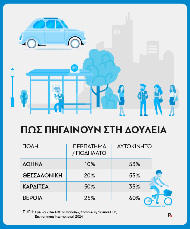 Σύμφωνα λοιπόν με τα στοιχεία, στην Αθήνα μόλις το 10% μετακινείται προς τη δουλειά με τα πόδια ή με ποδήλατο και το 53% με αυτοκίνητο. Το αντίστοιχο ποσοστό για τη Θεσσαλονίκη είναι 20% και 55%, και για τη Βέροια 25% και 60%. Θετική έκπληξη αποτελεί η Καρδίτσα, με το 50% να πηγαίνει στη δουλειά με τα πόδια ή με ποδήλατο και μόλις το 35% με αυτοκίνητο.