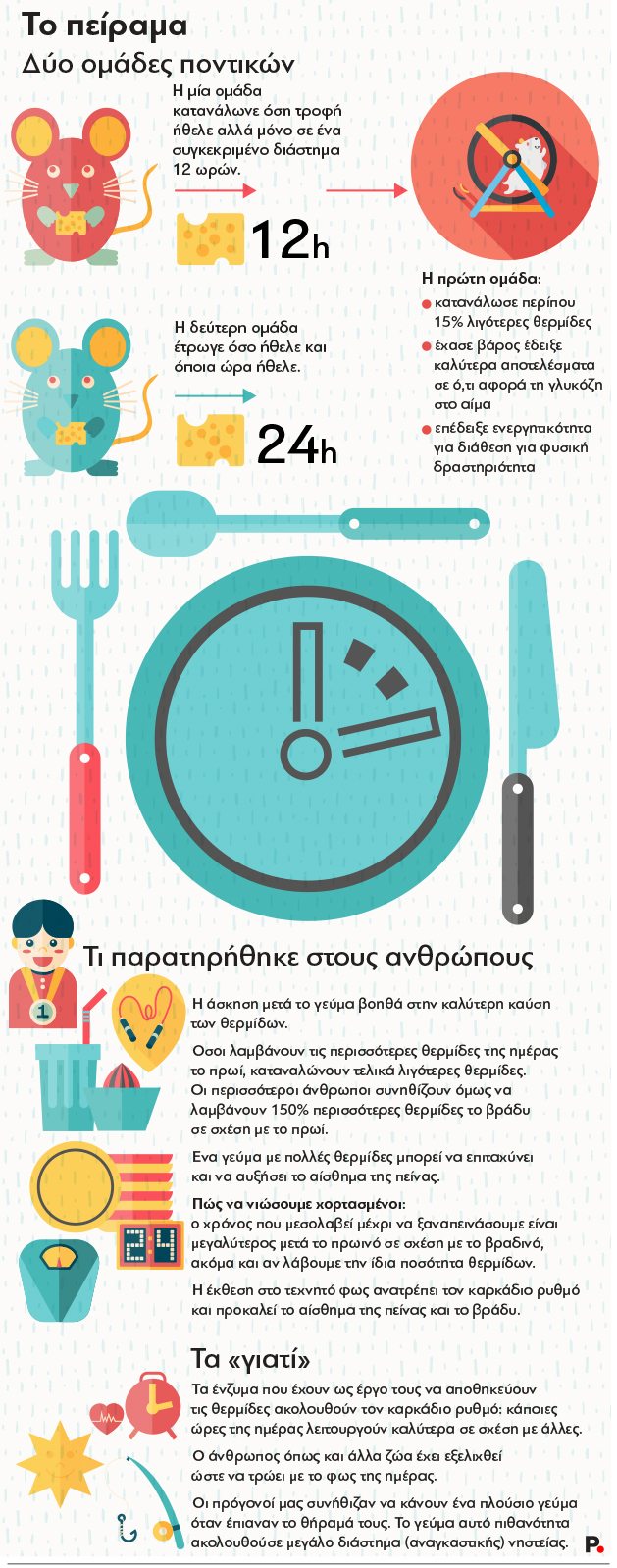 Ολες αυτές οι παράμετροι μεταβάλλονται συνεχώς κατά τη διάρκεια της ημέρας. Το να κατορθώσουμε να τρώμε σε συντονισμό με τον εσωτερικό ρυθμό του σώματος επιτρέπει στην τροφή να μεταβολίζεται χωρίς προβλήματα. Η έρευνα αποδεικνύει για μία ακόμα φορά τη σοφία των παλαιότερων. Το ρητό «πρωινό σαν βασιλιάς, μεσημεριανό σαν πρίγκιπας και δείπνο σαν φτωχός» συμπίπτει σε γενικές γραμμές με τα επιστημονικά συμπεράσματα.
