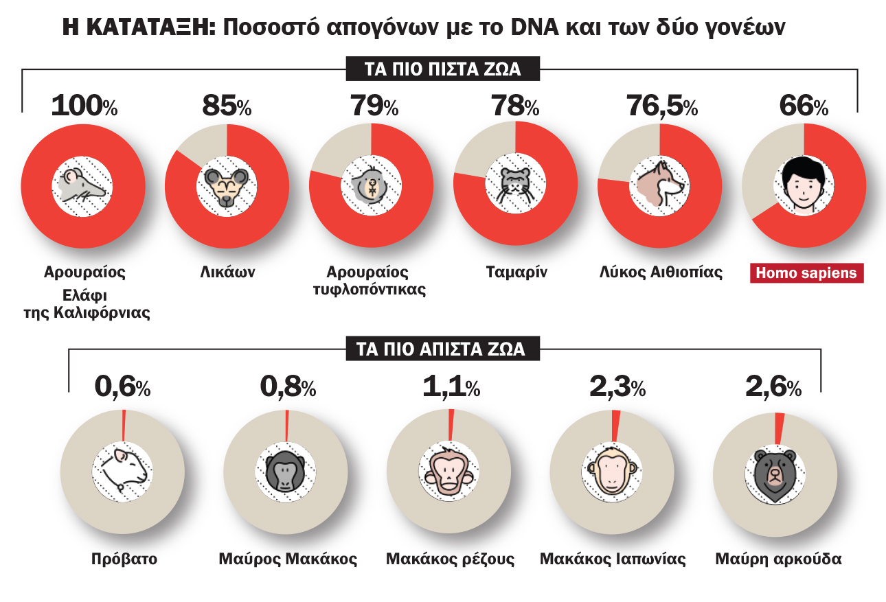 Οσο για τους στενούς (από εξελικτική άποψη) συγγενείς μας, τους ορεσίβιους γορίλες και τους χιμπαντζήδες, τα αντίστοιχα ποσοστά ήταν μόλις 6% και 4%. Οπως εξηγείται στο βρετανικό δημοσίευμα, παρότι συγγενεύουμε στενά, οι κοινωνικές δομές τους απέχουν σημαντικά από τις ανθρώπινες, με την πολυγαμία να είναι ο κανόνας μεταξύ των χιμπαντζήδων (πολλά αρσενικά ζευγαρώνουν με πολλά θηλυκά), ενώ οι γορίλες οργανώνονται γύρω από ένα κυρίαρχο αρσενικό, το οποίο ζευγαρώνει με πολλά θηλυκά.