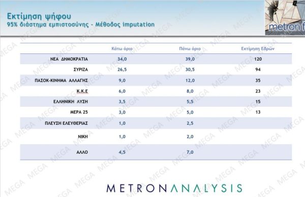 ♦ Η δημοσκόπηση-εκλογικό βαρόμετρο της Metron Analysis για το Mega που παρουσιάστηκε την Παρασκευή 19 Μαΐου έδινε, με βάση την εκτίμηση ψήφου, στη ΝΔ από 34 έως 39% και στον ΣΥΡΙΖΑ από 26,% έως 30,5%. Και πάλι το αποτέλεσμα ήταν εκτός του εύρους των ποσοστών (που για τη ΝΔ ήταν πέντε μονάδες). Η διαφορά μεταξύ των κομμάτων ήταν υπερδιπλάσια των εκτιμήσεων.