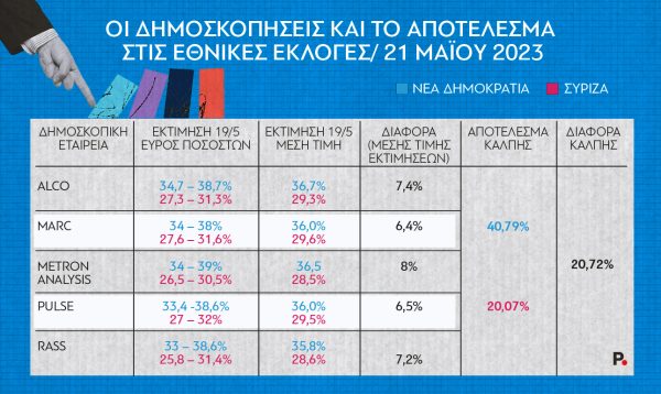 Τον Μάιο του 2023 όλες οι μεγάλες εταιρείες δημοσκοπήσεων «έπιασαν» ότι η ΝΔ θα κερδίσει τον ΣΥΡΙΖΑ, με βάση όλα τα σενάρια για το εύρος των ποσοστών των δύο κομμάτων. Εχασαν όμως και το 40,79% της ΝΔ, η οποία βρέθηκε πάνω από το εύρος που έδιναν, αλλά κυρίως το 20,07% του ΣΥΡΙΖΑ, ο οποίος βρέθηκε πολύ κάτω από το εύρος των προβλέψεων.