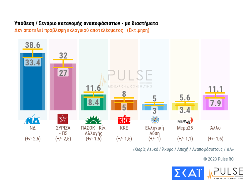 ♦ Στη δημοσκόπηση της Pulse για τον ΣΚΑΪ, που επίσης παρουσιάστηκε το βράδυ της Παρασκευής 19 Μαΐου, η εκτίμηση με βάση το σενάριο αναγωγής των αναποφάσιστων έδινε στη ΝΔ από 33,4 έως 38,6% και στον ΣΥΡΙΖΑ από 27% έως 32%. Οπως και στις τρεις προηγούμενες έρευνες, το αποτέλεσμα ήταν εκτός του εύρους και η διαφορά ΝΔ-ΣΥΡΙΖΑ ήταν τριπλάσια.