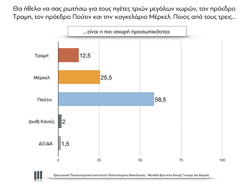 Στην πρόσφατη έρευνα της Μονάδας Ερευνών Κοινής Γνώμης και Αγοράς του Ερευνητικού Πανεπιστημιακού Ινστιτούτου του Πανεπιστημίου Μακεδονίας (24-25 Μαΐου 2018) ο Βλαντίμιρ Πούτιν, συγκριτικά με τον πρόεδρο των ΗΠΑ, Ντόναλντ Τραμπ και την καγκελάριο της Γερμανίας Ανγκελα Μέρκελ, θεωρείται με διαφορά η πιο ισχυρή προσωπικότητα (58,5%), ο πιο συμπαθής (48%), ότι έχει τα πιο θετικά χαρακτηριστικά (47%) και ότι θα ταίριαζε καλύτερα στη χώρα μας (39,5%). Το εντυπωσιακότερο; Εστω και με βραχεία κεφαλή, θεωρείται και ο πιο αξιόπιστος. Οι αριθμοί αυτοί σοκάρουν τους Ευρωπαίους και τους Αμερικανούς που δυσκολεύονται να αντιληφθούν πώς σκεφτόμαστε ως λαός. Πώς γίνεται ένας αυταρχικός ηγέτης να θεωρείται τόσο δημοφιλής σε μια δημοκρατική χώρα; Μια σειρά από υποθέσεις έχουν διατυπωθεί για τη ρωσόφιλη στάση των ελλήνων πολιτών.