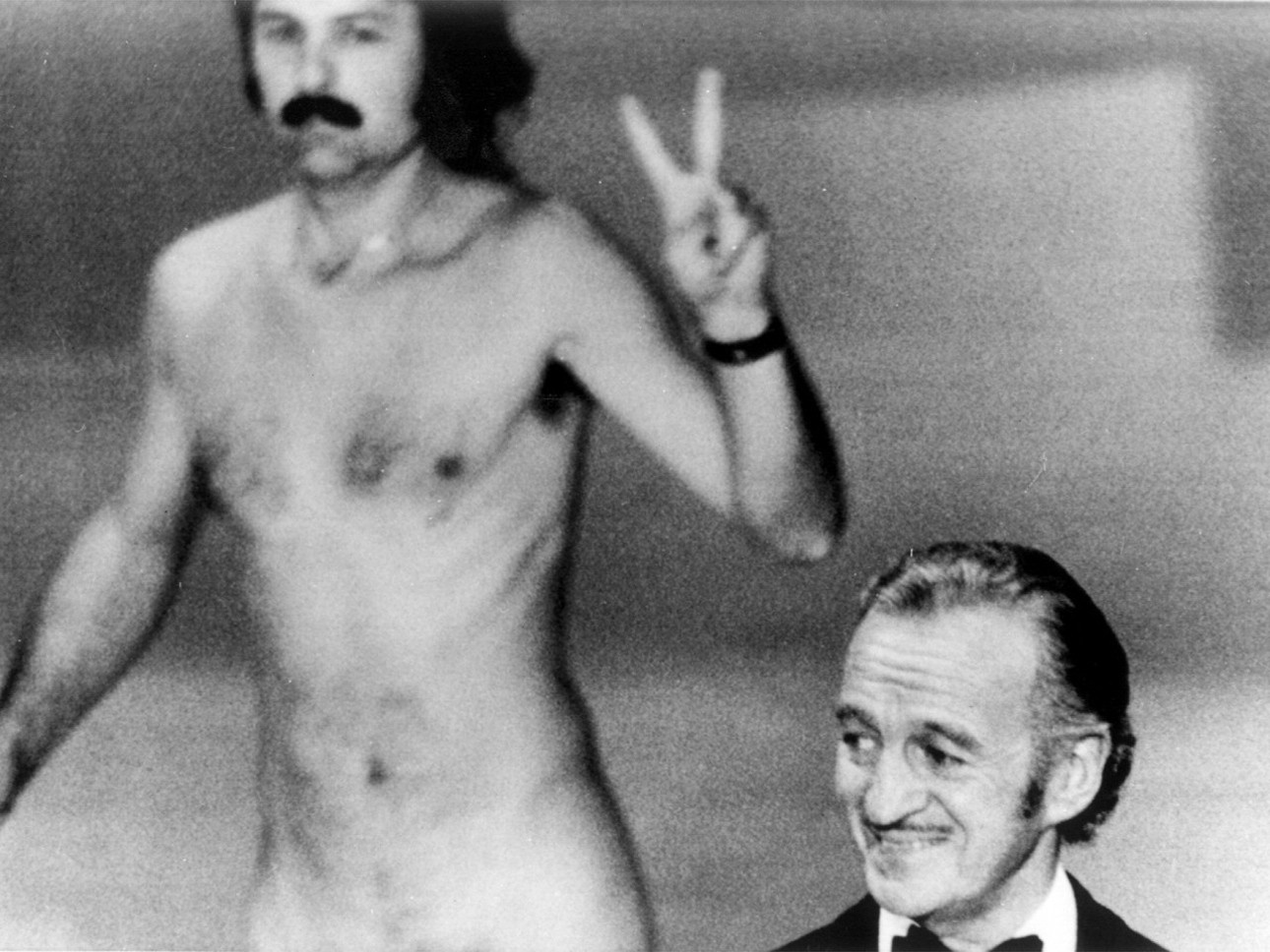 To timing ήταν σίγουρα το σωστό για τον Ρόμπερτ Οπελ, φωτογράφο και ακτιβιστή για τα δικαιώματα των ομοφυλοφίλων, που περίμενε τον Ντέιβιντ Νίβεν να καλέσει την Ελίζαμπεθ Τέιλορ στη σκηνή για να απονείμει το Οσκαρ της Καλύτερης Ταινίας του 1974. Τη στιγμή που ο Νίβεν μιλούσε για τη «σημαντική συνεισφορά της στην παγκόσμια ψυχαγωγία» ο Οπελ εμφανίστηκε γυμνός πίσω του κάνοντας το σήμα της ειρήνης. Ο ηθοποιός φάνηκε ευχαριστημένος από τις υστερικές κραυγές του κοινού μέχρι που συνειδητοποίησε τι είχε συμβεί και είπε: «Λοιπόν, κυρίες και κύριοι, …εντυπωσιακό δεν είναι να σκεφθεί κανείς ότι ο μόνος τρόπος να προκαλέσει γέλιο στη ζωή του είναι να γδυθεί και να δείξει τις μικροατέλειές του;»