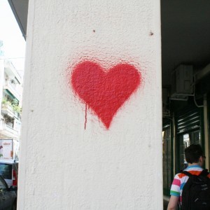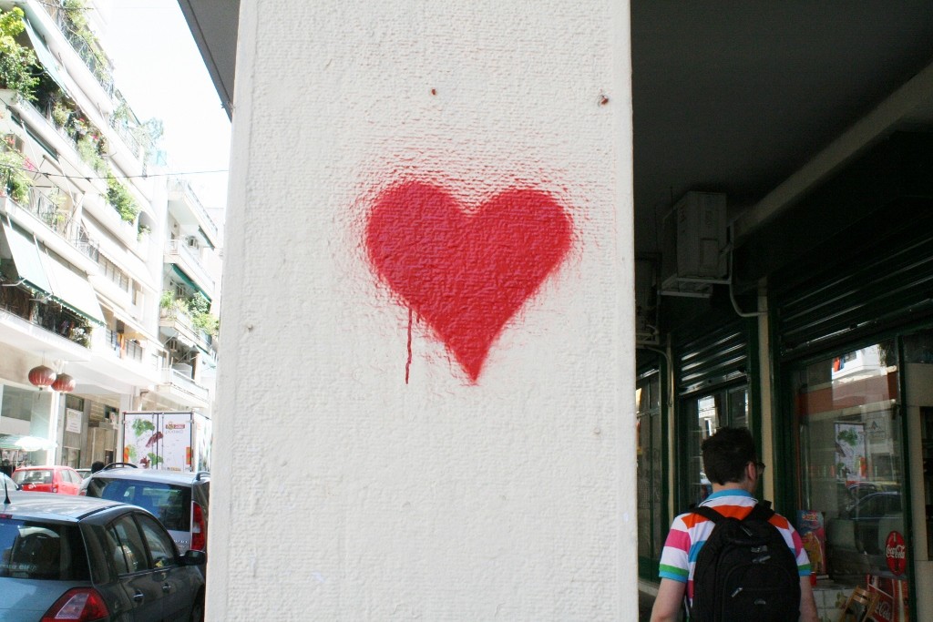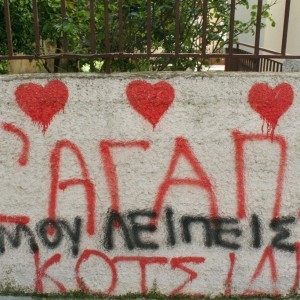 Στην επιφάνεια της πόλης, ανάμεσα σε πολύχρωμα tags, αναρχικά ή οπαδικά συνθήματα, αυτοκόλλητα και αφίσες, οι ερωτευμένοι «εκπέμπουν» αναρίθμητα σήματα αγάπης. Συνήθως χωρίς υπογραφή. Αρκεί που το γνωρίζουν οι παραλήπτες. Το τελευταίο, πάντως, δεν είναι καθόλου δεδομένο. Είτε γιατί το μήνυμα γράφτηκε –και παραμένει- εν αγνοία τους, είτε γιατί δεν έτυχε να περάσουν από την περιοχή για να δουν το «συστημένο» γκράφιτι.