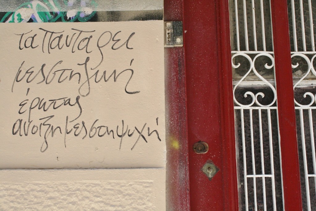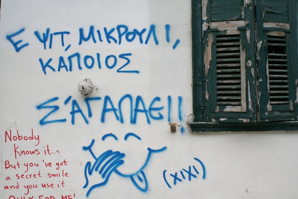 Τα μηνύματα σε αυτή την περίπτωση αλλάζουν ύφος και το χιούμορ (συχνά, με χτυπήματα κάτω απ’ τη μέση) παίρνει το λόγο: «Είναι να μην μπλέξεις με Γιώργο!» γράφει κάποια, πιθανότατα παθούσα, σε μια γωνιά της Αθήνας. Ο τρόπος που λέμε «σ’ αγαπώ» αλλάζει, καθώς οι σχέσεις μας εξελίσσονται. Ένα πράγμα όμως είναι βέβαιο –το χιούμορ συχνά βοηθά.