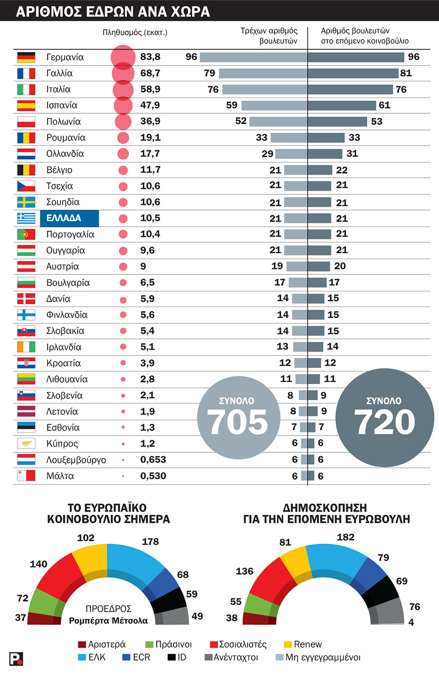 Κάθε έθνος εκλέγει συγκεκριμένο αριθμό ευρωβουλευτών, ο οποίος καθορίζεται από τον πληθυσμό κάθε χώρας. Η Γερμανία, η πολυπληθέστερη χώρα του μπλοκ, θα εκλέξει 96 από τους 720 βουλευτές, ενώ η μικρότερη απ’ όλες Μάλτα μόλις έξι. Κάθε χώρα επιλέγει τα μέλη του Ευρωπαϊκού Κοινοβουλίου σύμφωνα με το εθνικό της εκλογικό σύστημα.