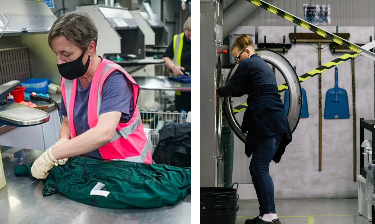 Ενα ρούχο που επιστρέφεται κάνει πολλές στάσεις στις εγκαταστάσεις της ACS πριν ενοικιαστεί ξανά ή μεταπωληθεί. Αφού ξετυλιχθεί, αξιολογηθεί και απολυμανθεί με όζον σε έναν σταθμό απολύμανσης που θυμίζει εσωτερικό φορτηγού, ένα κατεστραμμένο αντικείμενο θα φτάσει στο πόστο της επόπτριας στεγνού καθαρισμού Αντζελα Γκραντ, μιας βετεράνου με 28 χρόνια εμπειρίας.